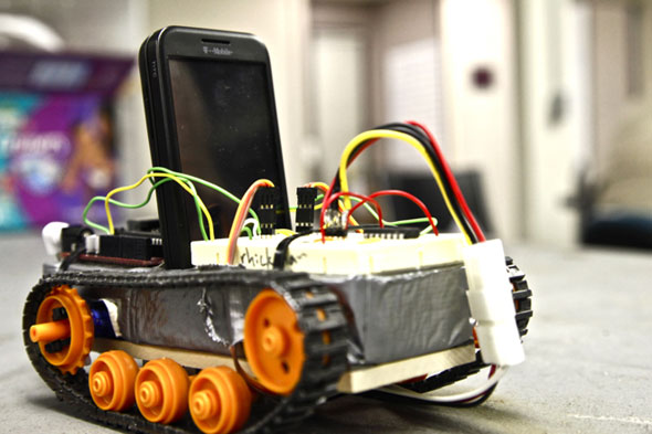 据报道,他们用及身边能找到的极其简单的材料制造出一辆玩具机器坦克,该坦克使用一台台湾宏达电的G1作为该机器坦克的“大脑”(见图),车架及其它部件一共只花了30美元,坦克基于开源的Arduino平台。该系统仍不完善:手机只能命令机器坦克朝着某一特定方向前进。工程师们正在研究手机与Android软件结合得更紧密的机器人。